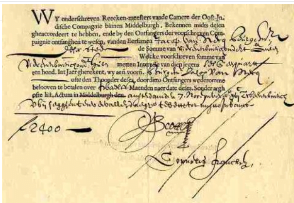 The holder of the share certificated of the Dutch East India Company that serve has featured image of this post was Pieter Harmensz. The share is worth 150 guilders. Dated September 9, 1606, this is the oldest known stock certificate in the world. A Dutch university student named Ruben Schalk discovered it..